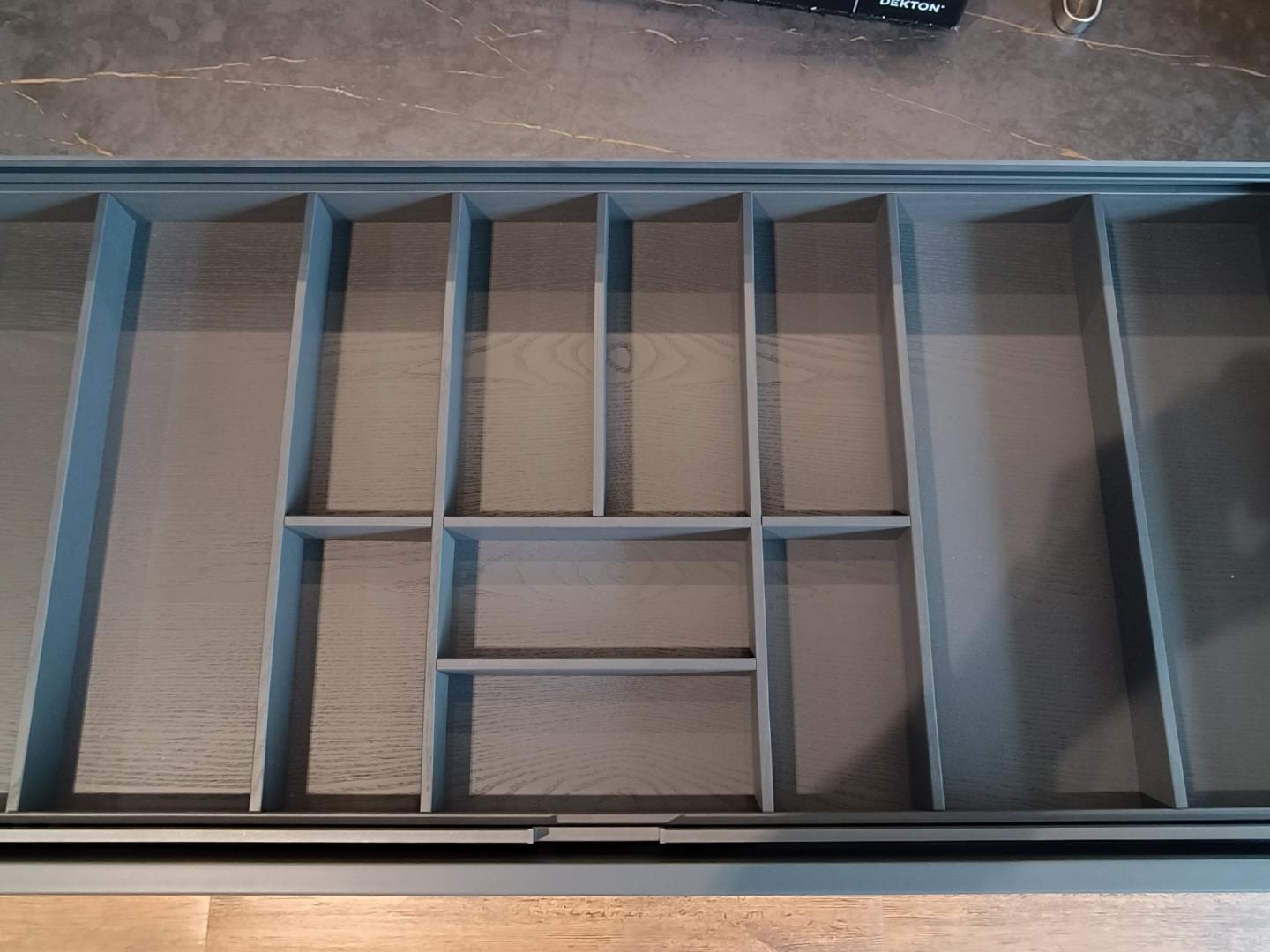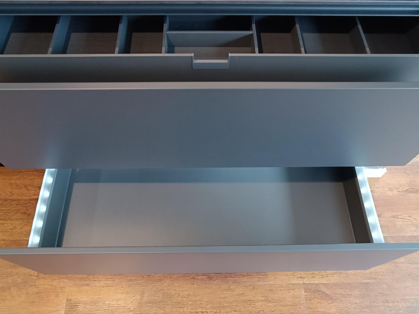 Eine Dekton-Arbeitsplatte verleiht der Küche eine hochwertige und langlebige Oberfläche, die sowohl hitze- als auch kratzfest ist. Diese exklusive Arbeitsplatte wird durch die beleuchteten Auszüge ergänzt, die nicht nur für eine elegante Optik sorgen, sondern auch die Übersicht und den Zugriff auf den Inhalt erleichtern.