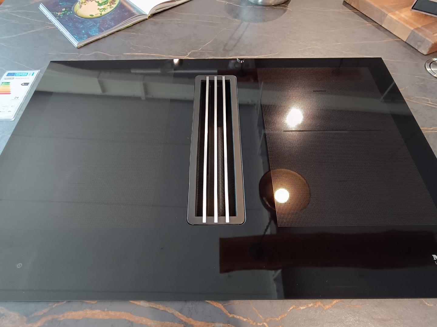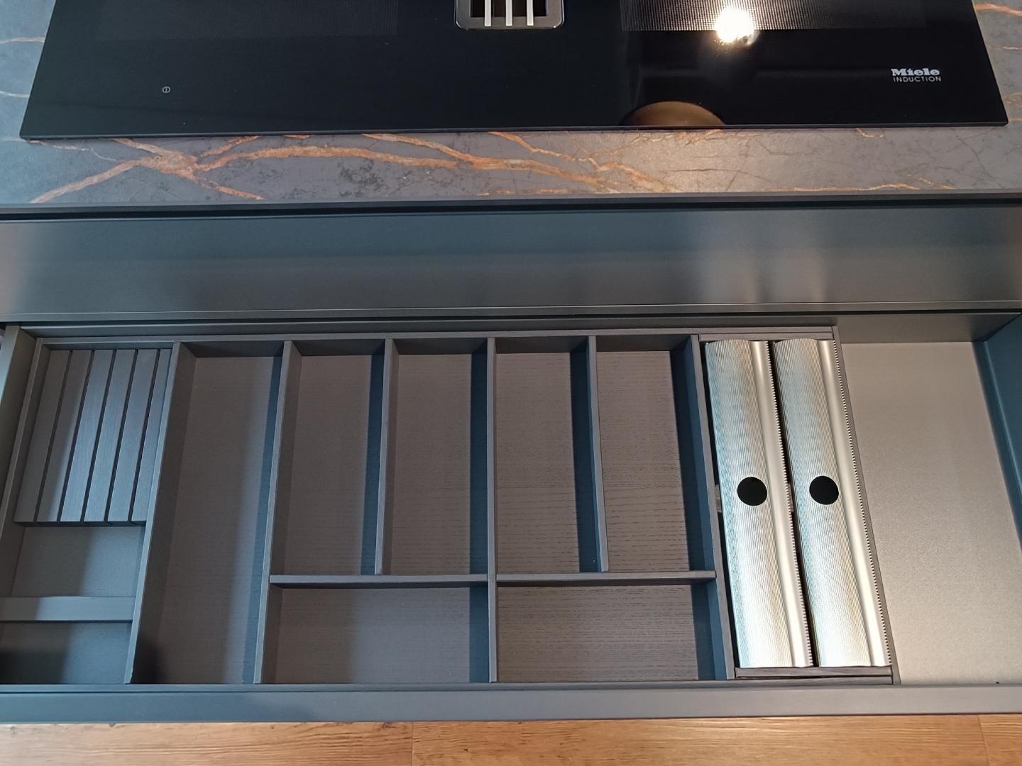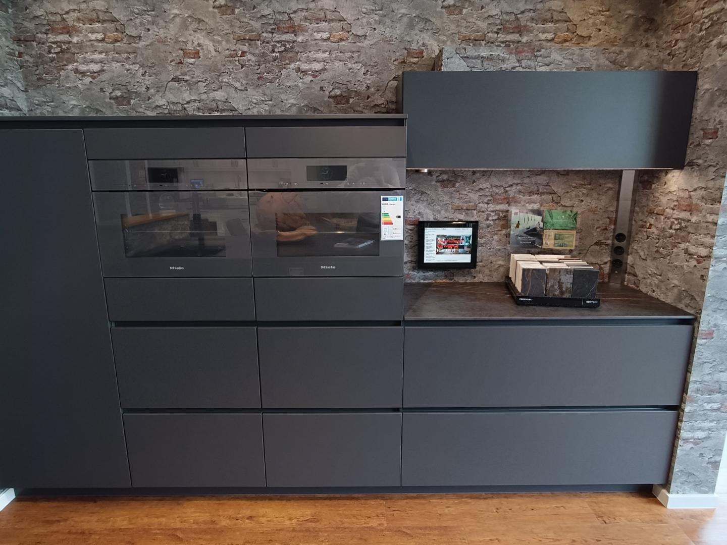 Die Küche besticht zudem durch grifflos integrierte Elektrogeräte aus der Artline von Miele in passendem Farbton Graphitgrau, die ein nahtloses und modernes Erscheinungsbild garantieren. Ein besonderes Highlight ist das Kochfeld mit integriertem Abzug, das sowohl den Blick in den Wohnbereich ermöglicht, als auch für eine optimal Luftreinigung während des Kochens sorgt.